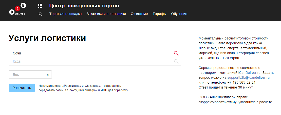 Сервис позволяет также рассчитать стоимость и заказать перевозку тех товаров, закупки которых проводятся вне системы B2B-Center.