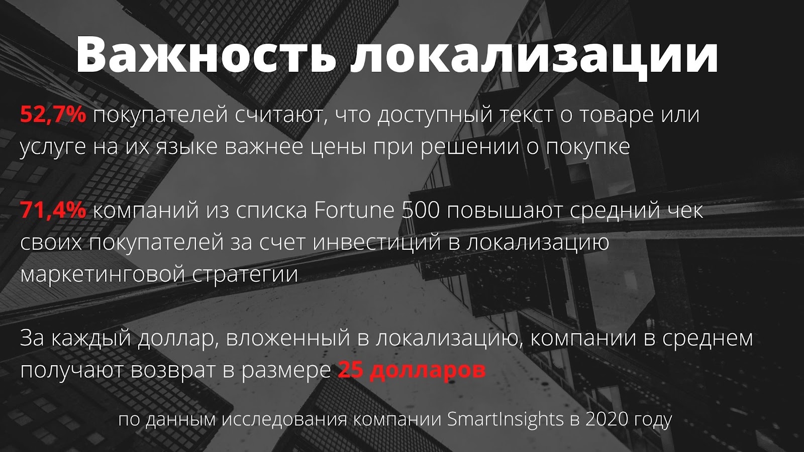 Именно через маркетинговую локализацию бренда выстраивается эффективная коммуникационная стратегия, которая позволяет доносить ценности и уникальность вашей компании до клиентов на их языке.
