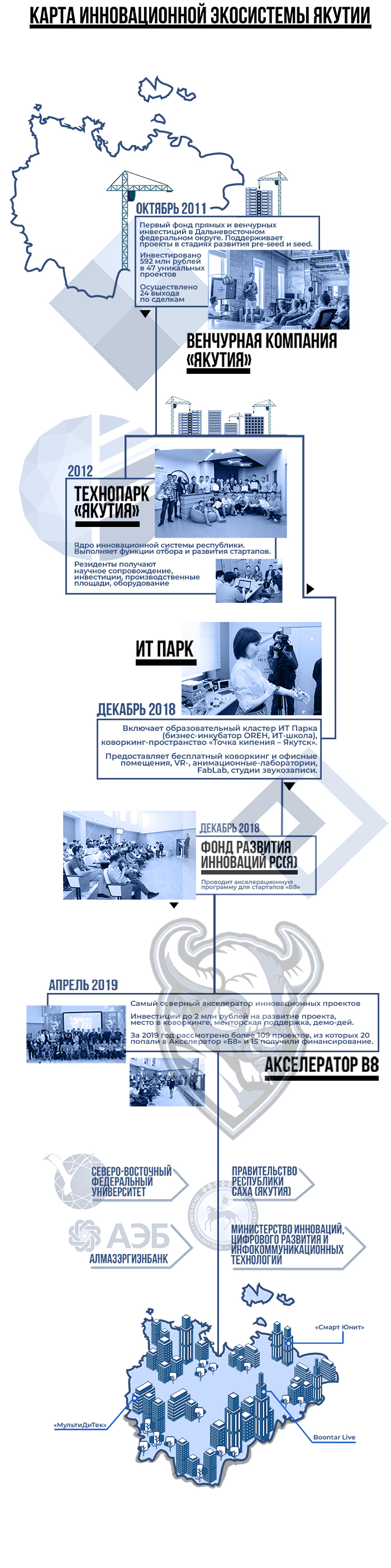 А еще в республике проходят крупные события для стартапов — региональный этап Open Innovations Startup Tour и первая на Дальнем Востоке региональная инициатива «Стартап Экспедиция». Но обо всем по порядку. Сегодня мы рассмотрим часть стартап-экосистемы Якутии.