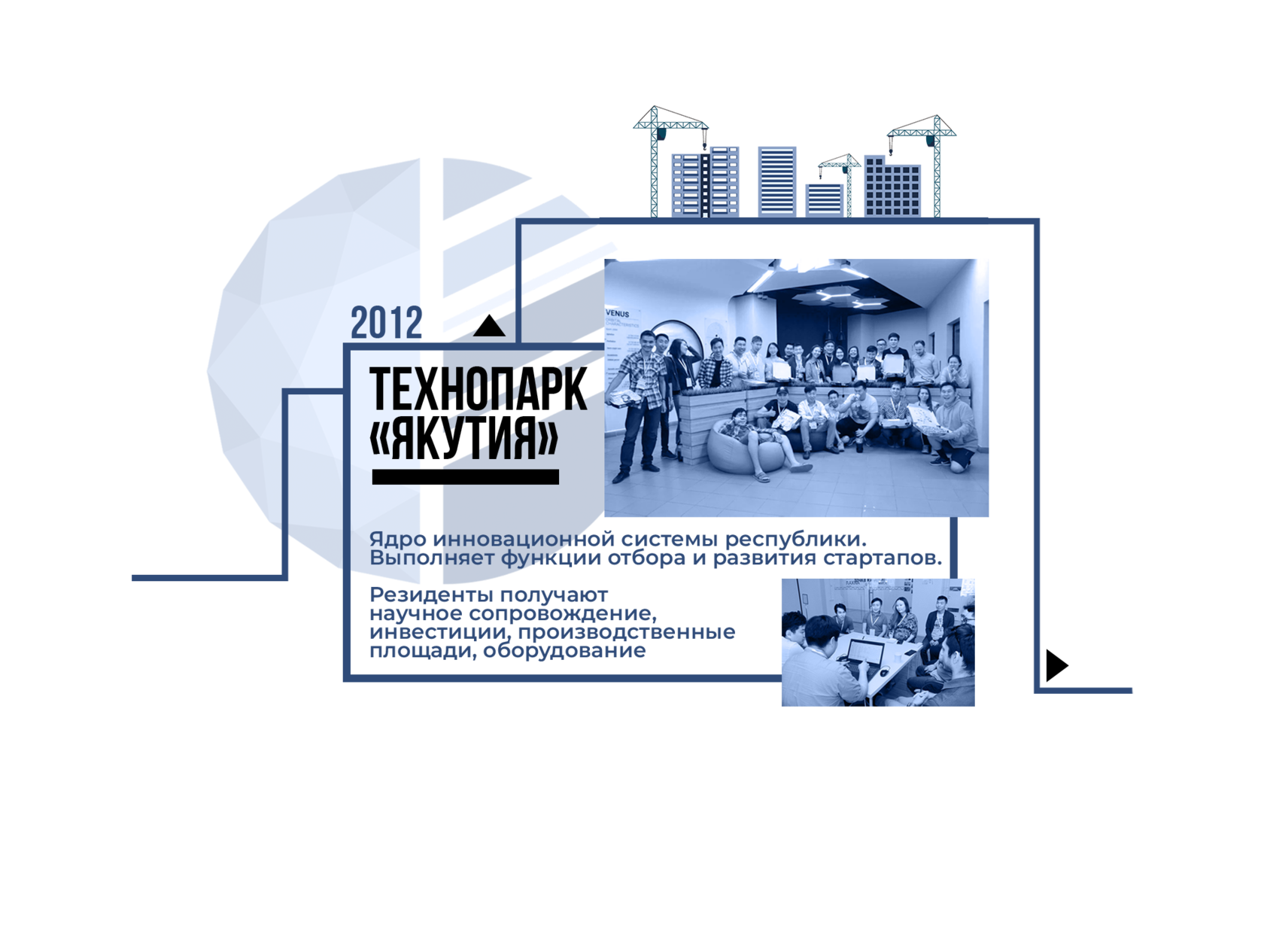 Технопарк «Якутия» был создан в 2011 году и стал одним из первых столпов цифровой трансформации республики. Технопарк сейчас — это основной инструмент и площадка для внедрения технологических идей в жизнь. На его мощностях создаются инновационные продукты и проводятся исследования для будущих проектов.