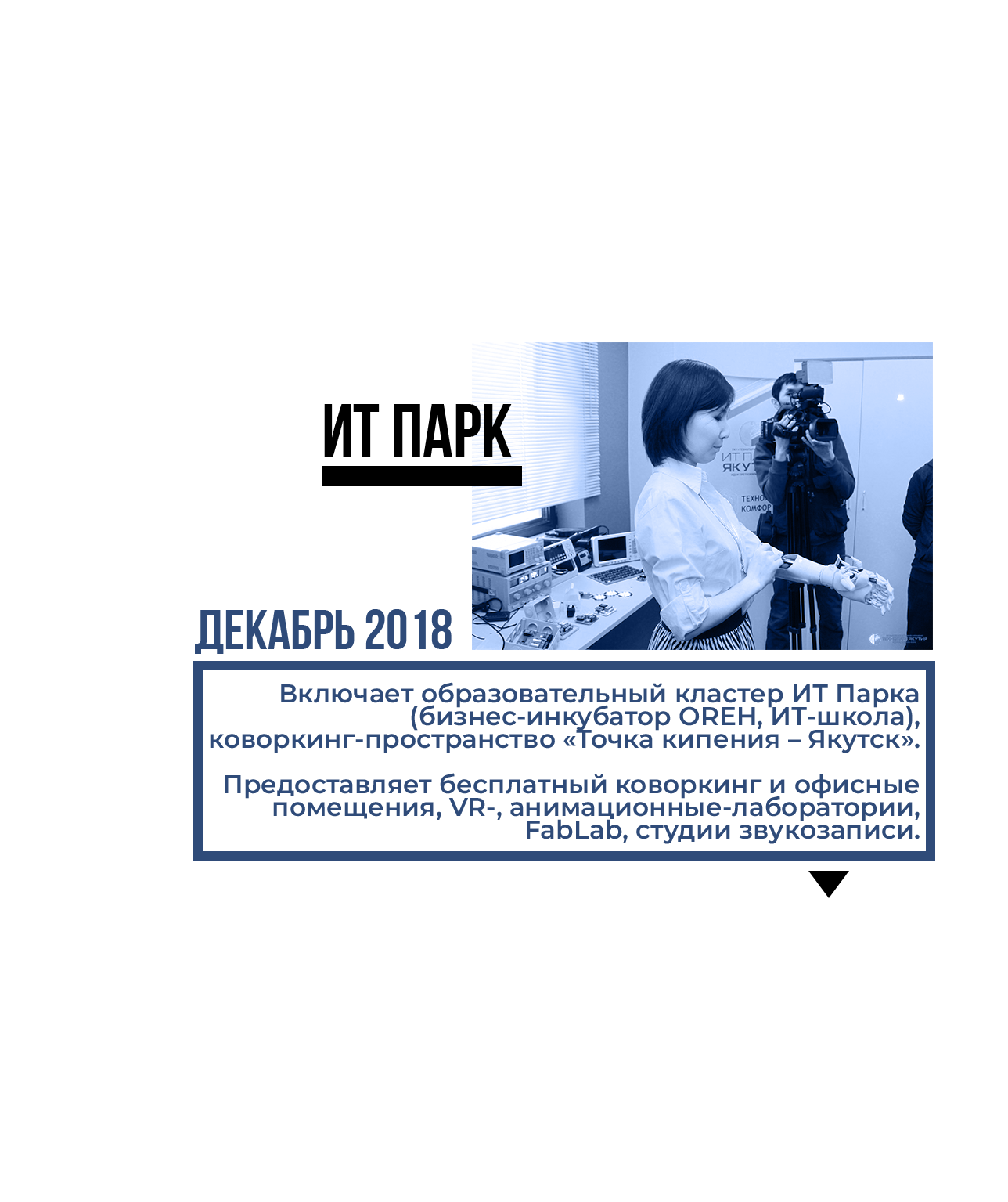 ИТ Парк в Якутске открылся в 2018 году и стал первым подобным пространством на Дальнем Востоке. Он обеспечил необходимой инфраструктурой и действующие технологические компании, и только зарождающиеся команды, и одиночных авторов проектов «на бумаге».