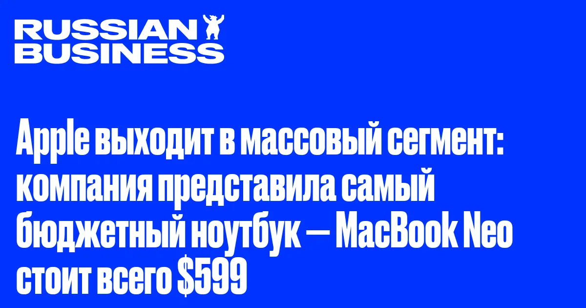 MacBook Neo стал самым дешёвым ноутбуком Apple. Как сообщили в CDEK.Shopping, стоимость устройства в России будет начинаться от 58 154 руб.