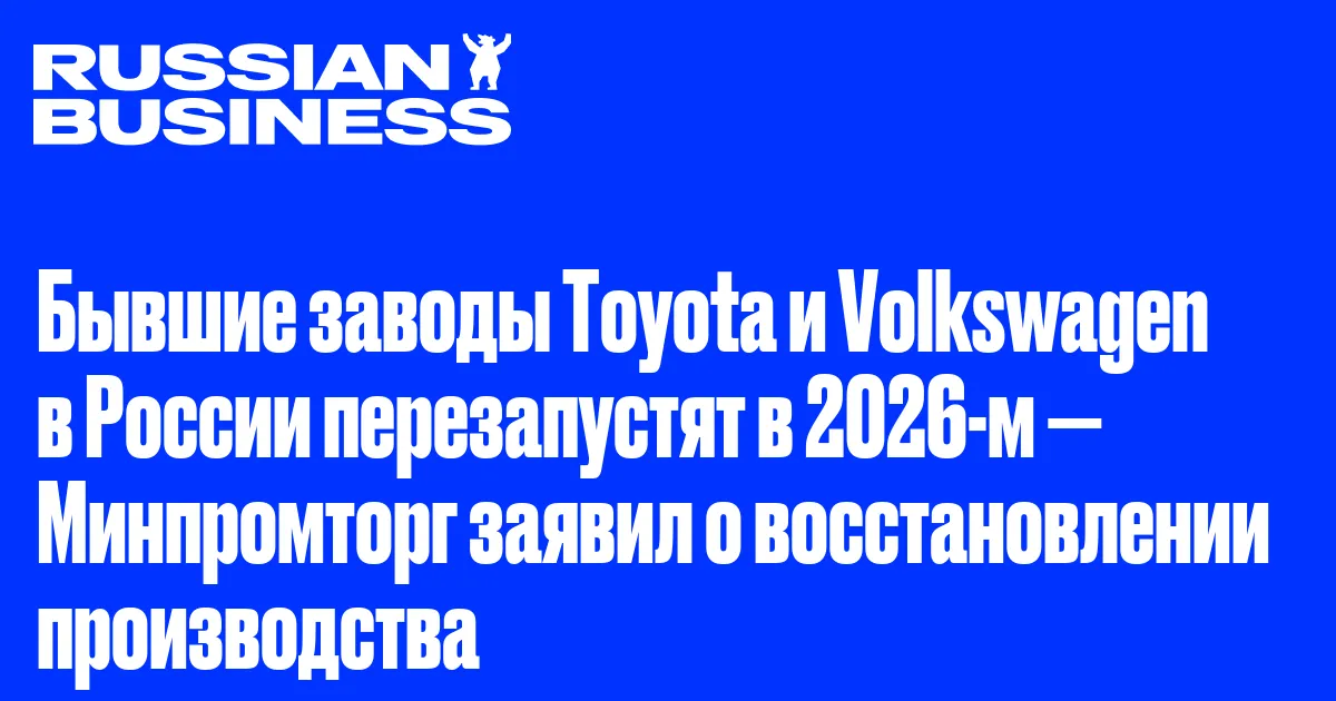 Бывшие заводы Toyota и Volkswagen в России перезапустят в 2026-м — Минпромторг заявил о восстановлении производства