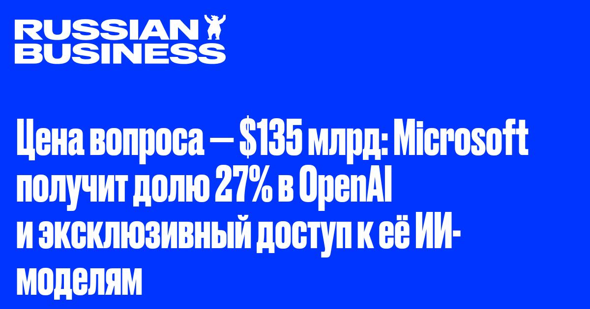 OpenAI завершает рекапитализацию и меняет структуру управления: появляется некоммерческий фонд OpenAI Foundation, который будет контролировать коммерческую OpenAI Group PBC. В рамках сделки Microsoft получает около 27% в OpenAI (оценка пакета — $135 млрд) и долгосрочный доступ к моделям и ИИ-технологиям до 2032 года. На этом фоне акции Microsoft в США прибавили почти 4%