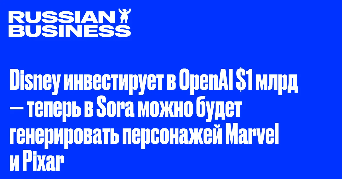 Disney инвестирует $1 млрд в OpenAI и впервые позволит использовать персонажей своих крупнейших франшиз — «Звёздных войн», Marvel и Pixar — в генераторе AI-видео Sora, сообщает Reuters. Видео с культовыми персонажам (например, Микки Маусом, Золушкой или Муфасой) начнут появляться уже в следующем году. Этой сделки OpenAI добивалась год.