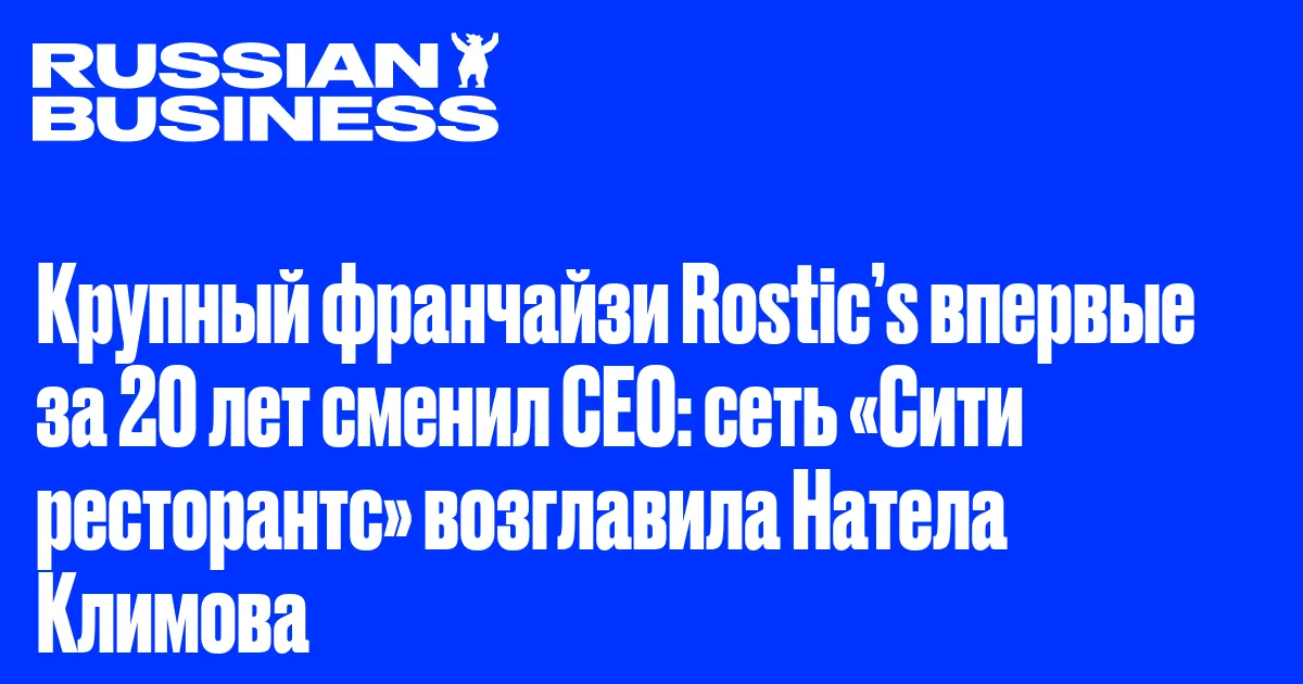 Крупный франчайзи сети Rostic’s ООО «Сити ресторантс» сменил генерального директора впервые за 20 лет, сообщает «Коммерсант». Новым CEO стала Натела Климова, ранее работавшая в Mothercare. Под управлением «Сити ресторантс» сейчас находится более 70 ресторанов Rostic’s по всей России.