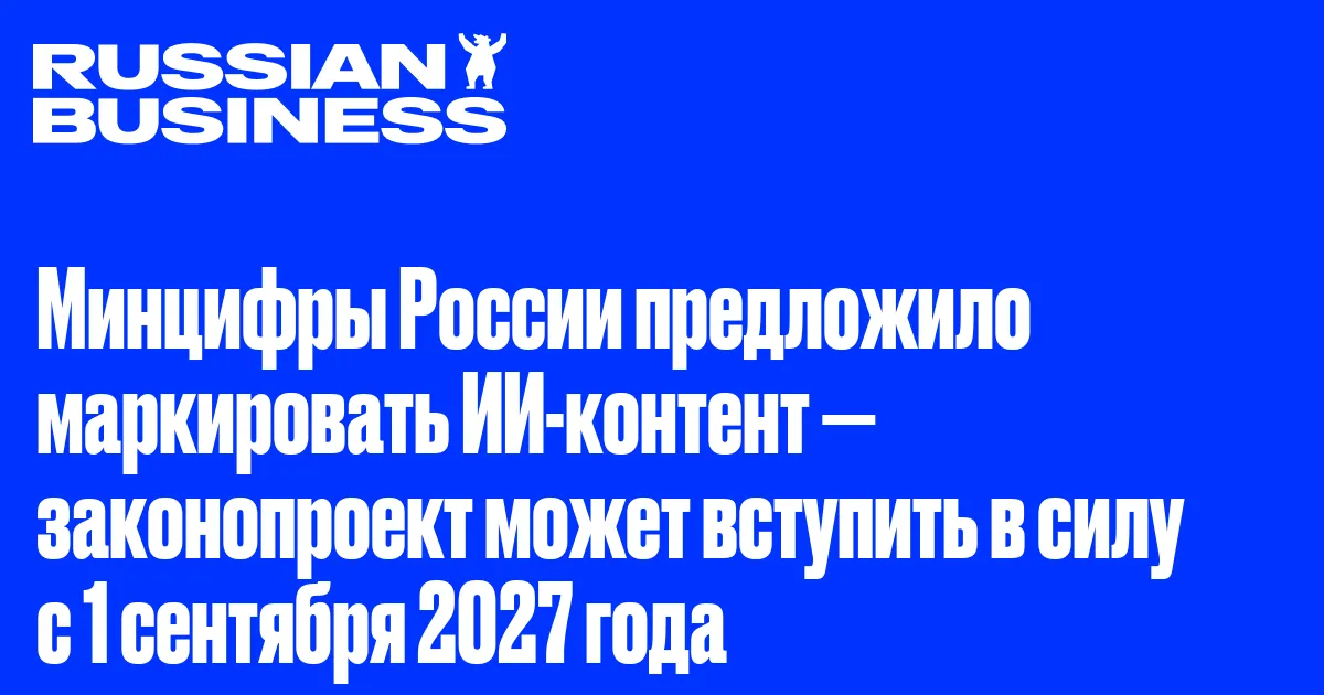 Минцифры России разработало законопроект о государственном регулировании искусственного интеллекта, который предусматривает обязательную маркировку контента, созданного с помощью нейросетей. Маркировку должны обеспечить владельцы ИИ-сервисов, а крупные соцсети будут обязаны проверять её наличие. Документ может вступить в силу с 1 сентября 2027 года.