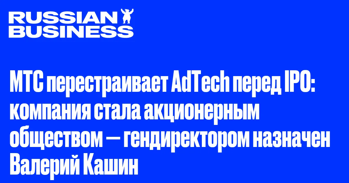 МТС преобразовала рекламную «дочку» МТС AdTech из ООО в акционерное общество и назначила Валерия Кашина генеральным директором компании, выяснил Forbes. Реорганизация проходит на фоне подготовки рекламного бизнеса к IPO — о планах вывода AdTech на биржу в МТС заявляли ранее.