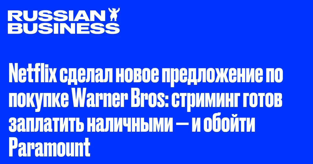 Netflix изменил предложение по покупке активов Warner Bros. Discovery — теперь стриминговый сервис готов полностью закрыть сделку наличными. По данным Reuters, общая оценка бизнеса осталась прежней — $82,7 млрд. Совет директоров Warner Bros единогласно поддержал обновлённое предложение, несмотря на то, что Paramount Skydance предлагает более высокую цену.