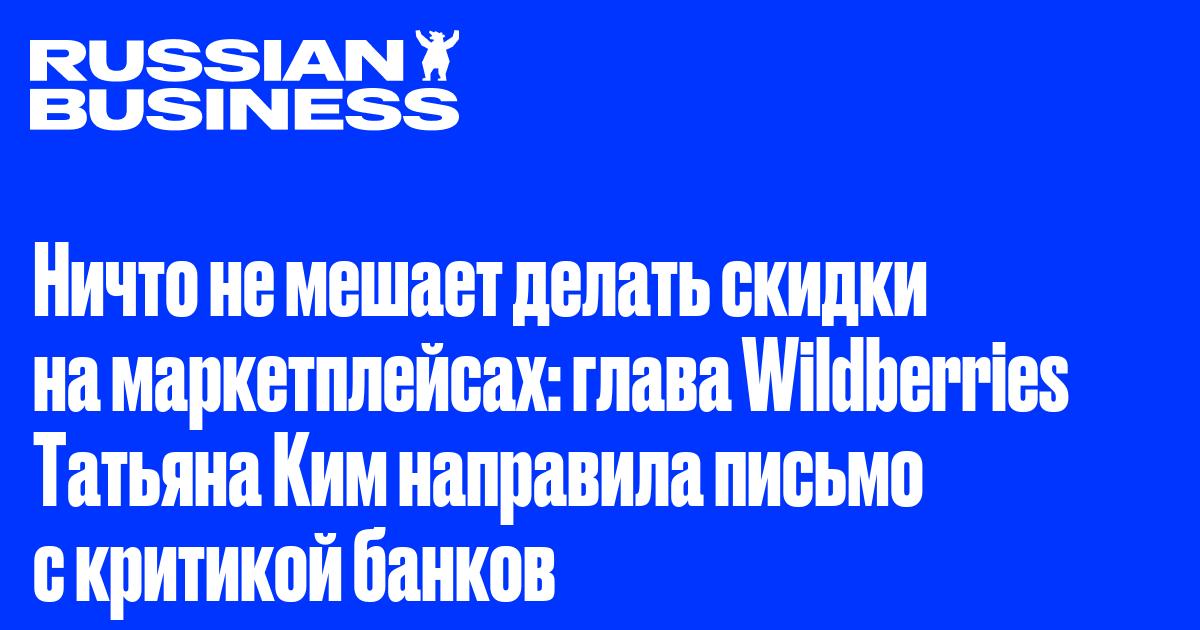 Глава Wildberries&Russ Татьяна Ким направила открытое письмо в ЦБ, правительство и Федеральное собрание, которое публикует «Коммерсантъ». В обращении она заявляет, что ограничение скидок и способов оплаты на маркетплейсах ударит по малому бизнесу, продажи которого во многом зависят от цифровых платформ. Поводом для обращения стало требование российских банков запретить скидки, привязанные к способу оплаты.