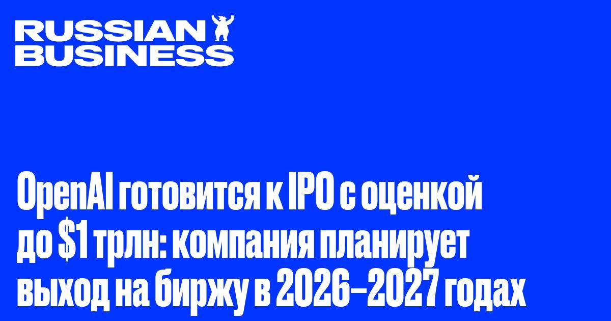 Как сообщает Reuters, OpenAI, разработчик ChatGPT, начала подготовку к первичному публичному размещению акций, которое может стать одним из крупнейших в истории технологического рынка. По данным агентства, оценка компании при IPO может достичь $1 трлн, а выход на биржу запланирован на 2026–2027 годы.