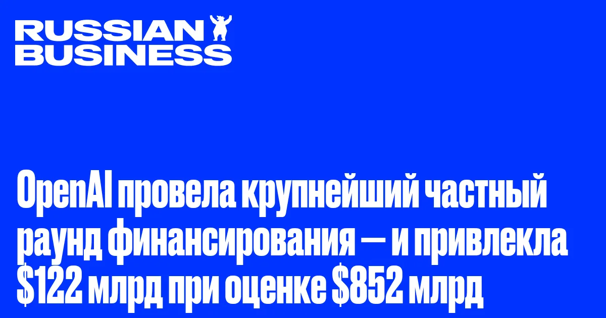 OpenAI привлекла $122 млрд инвестиций при оценке компании в $852 млрд, сообщил Bloomberg. Это крупнейший раунд финансирования в истории компании. Основная часть средств поступила от трёх технологических гигантов — Amazon, Nvidia и SoftBank. Финансирование будет направлено на развитие инфраструктуры: закупку чипов, строительство дата-центров и расширение команды.