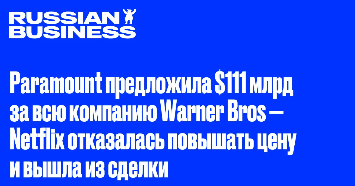 Netflix отказалась от покупки Warner Bros. Discovery, пишет Bloomberg. Paramount Skydance предложила $111 млрд за всю компанию — против $82,7 млрд, которые Netflix готова была заплатить за студии и стриминг. После появления новой оферты у Netflix было четыре рабочих дня, чтобы улучшить условия, однако компания не стала перебивать цену.