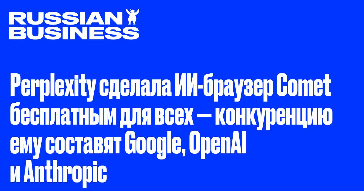 Perplexity AI объявила о глобальном запуске своего ИИ-браузера Comet, который теперь будет бесплатным для всех пользователей. Компания рассчитывает, что такой шаг поможет ей усилить позиции в условиях растущей конкуренции с Google, OpenAI и Anthropic, пишет CNBC. Бесплатный доступ делает Comet потенциальным массовым продуктом и ключевым инструментом в борьбе за аудиторию.