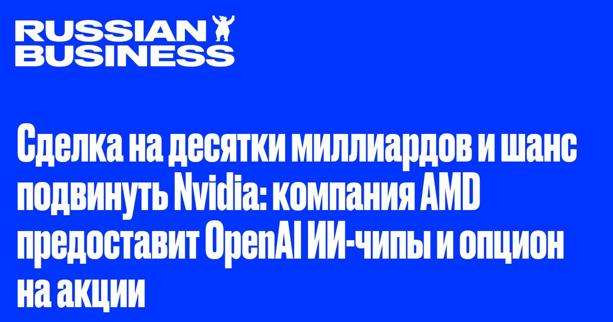 Компания-производитель интегральных микросхем AMD заключила крупнейшее соглашение в своей истории — поставку чипов искусственного интеллекта для OpenAI. Контракт оценивается в десятки миллиардов долларов и предусматривает опцион для OpenAI на покупку до 10% акций AMD. После объявления сделки акции компании подскочили на 38%, достигнув $226,71, что стало крупнейшим внутридневным ростом более чем за девять лет.