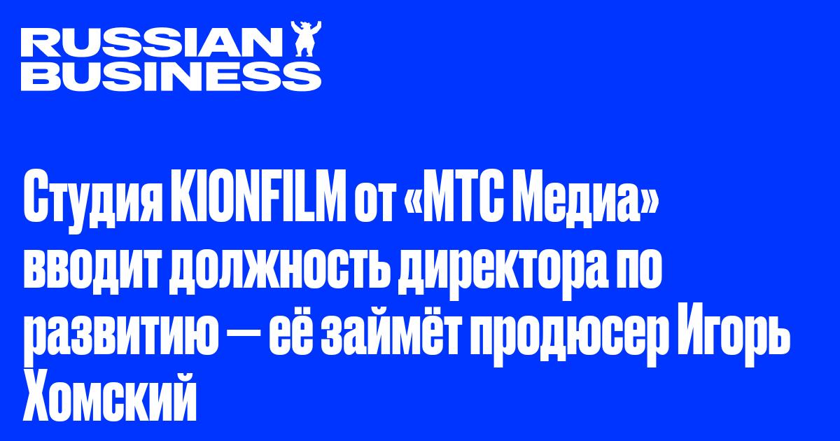 KIONFILM, собственная студия «МТС Медиа», ввела новую управленческую позицию — директора по развитию. Её занял продюсер и культурный менеджер Игорь Хомский. С апреля 2024 года Хомский занимал должность директора по взаимодействию с индустрией в холдинге «МТС Медиа».