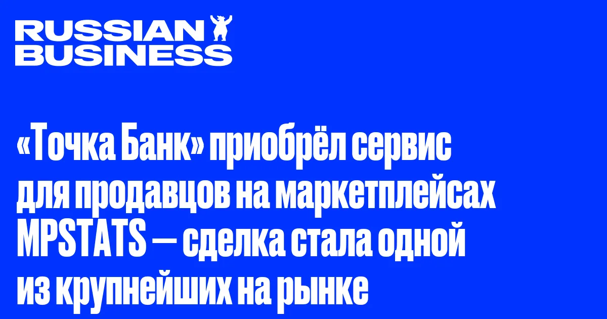 «Точка Банк» приобрёл 100% компании MPSTATS — одного из крупнейших игроков на рынке решенийдля продавцов на маркетплейсах. Сегодня компания занимает более трети сегмента сервисов для селлеров и предлагает инструменты для анализа, продвижения и автоматизации торговли. Как сообщили в банке, сделка стала одной из крупнейших на рынке.