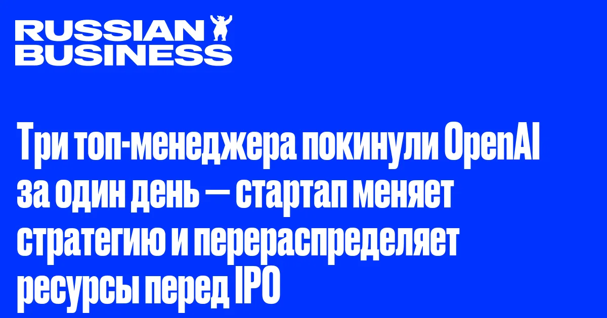 OpenAI за один день лишилась сразу трёх топ-менеджеров, сообщает Business Insider. Компанию покинули глава научных исследований Кевин Вейл, руководитель AI-видеоприложения Sora Билл Пиблс и технический директор по B2B-приложениям Шринивас Нараянан. OpenAI теряет руководителей на фоне перераспределения ресурсов и усиления фокуса на ChatGPT перед предстоящим IPO.