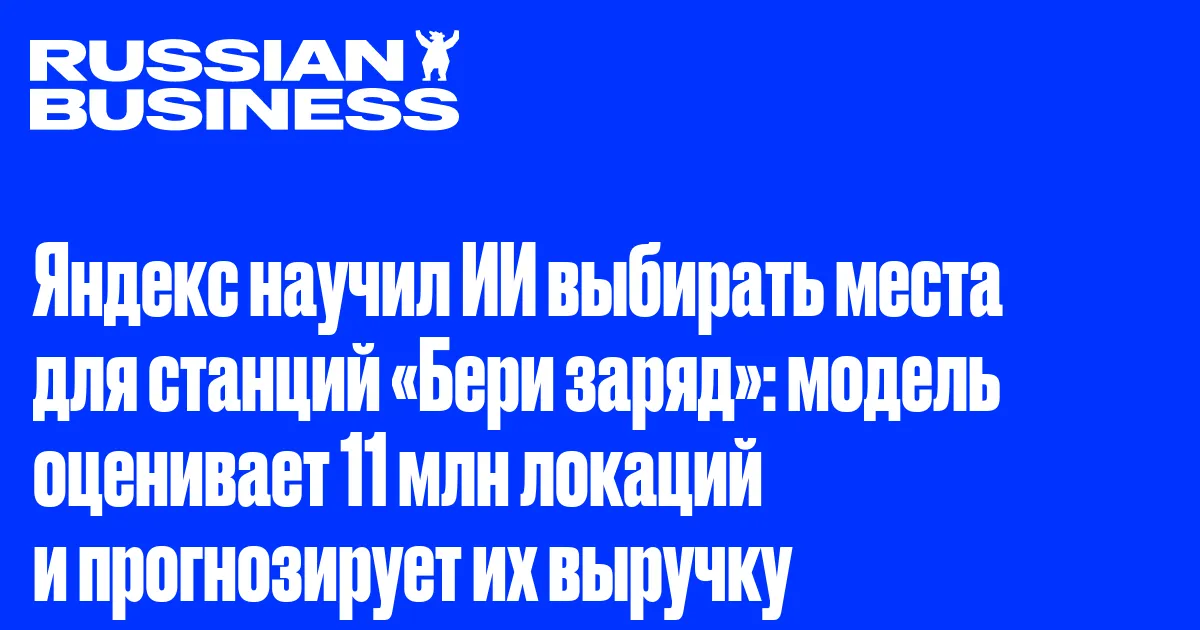 Яндекс научил ИИ выбирать места для станций «Бери заряд»: модель оценивает 11 млн локаций и прогнозирует их выручку