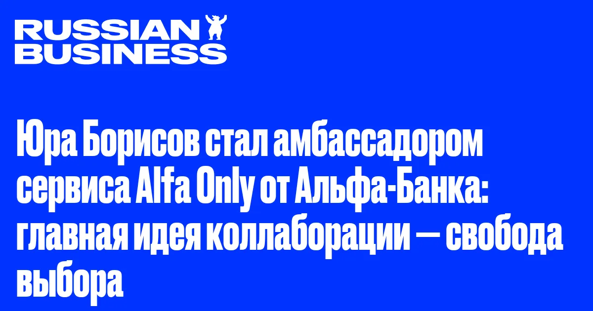 Актёр Юра Борисов стал амбассадором премиального сервиса Alfa Only, сообщили в пресс-службе Альфа-Банка. Ролик с актёром покажут на ТВ, городских экранах и в онлайн-каналах. Сюжет первой коллаборации построен вокруг игры слов «Он ли?» и темы личного выбора и внутренней свободы.